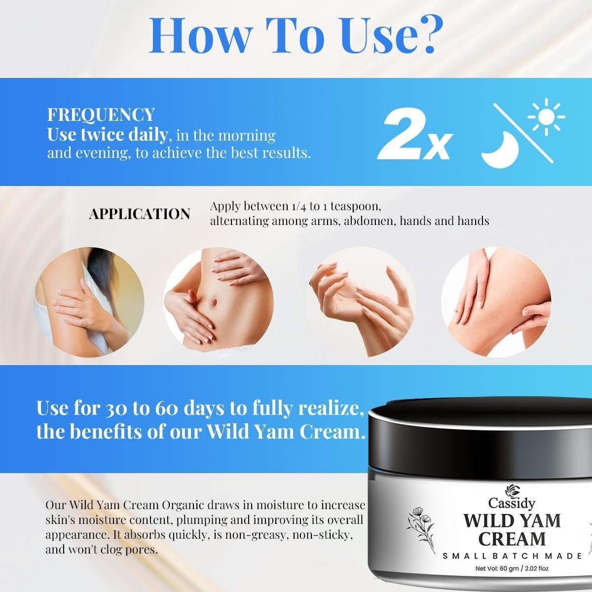 The CASSIDY Wild Yam Cream is a rich and nourishing moisturizer designed to support your skin's health and vitality. Its creamy texture glides on effortlessly, providing deep hydration while helping to improve skin texture. Ideal for daily use, this cream helps to soothe and revitalize your skin, leaving it feeling soft and smooth. Enjoy a more youthful and radiant appearance with this delightful cream that?s perfect for your skincare routine. Treat your skin to the care it deserves!